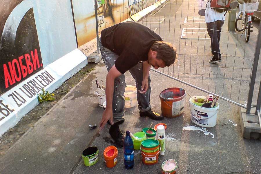 Для начала пришлось реставрировать саму осыпающуюся бетонную стену: качество- то советское. Для этого первым делом смыли все картины-граффити, которые там были нарисованы в 1990 году. После укрепления бетона, нанесения особого защитного покрытия, все художники были официально приглашены в Берлин, чтобы они воссоздали прежние свои творения.